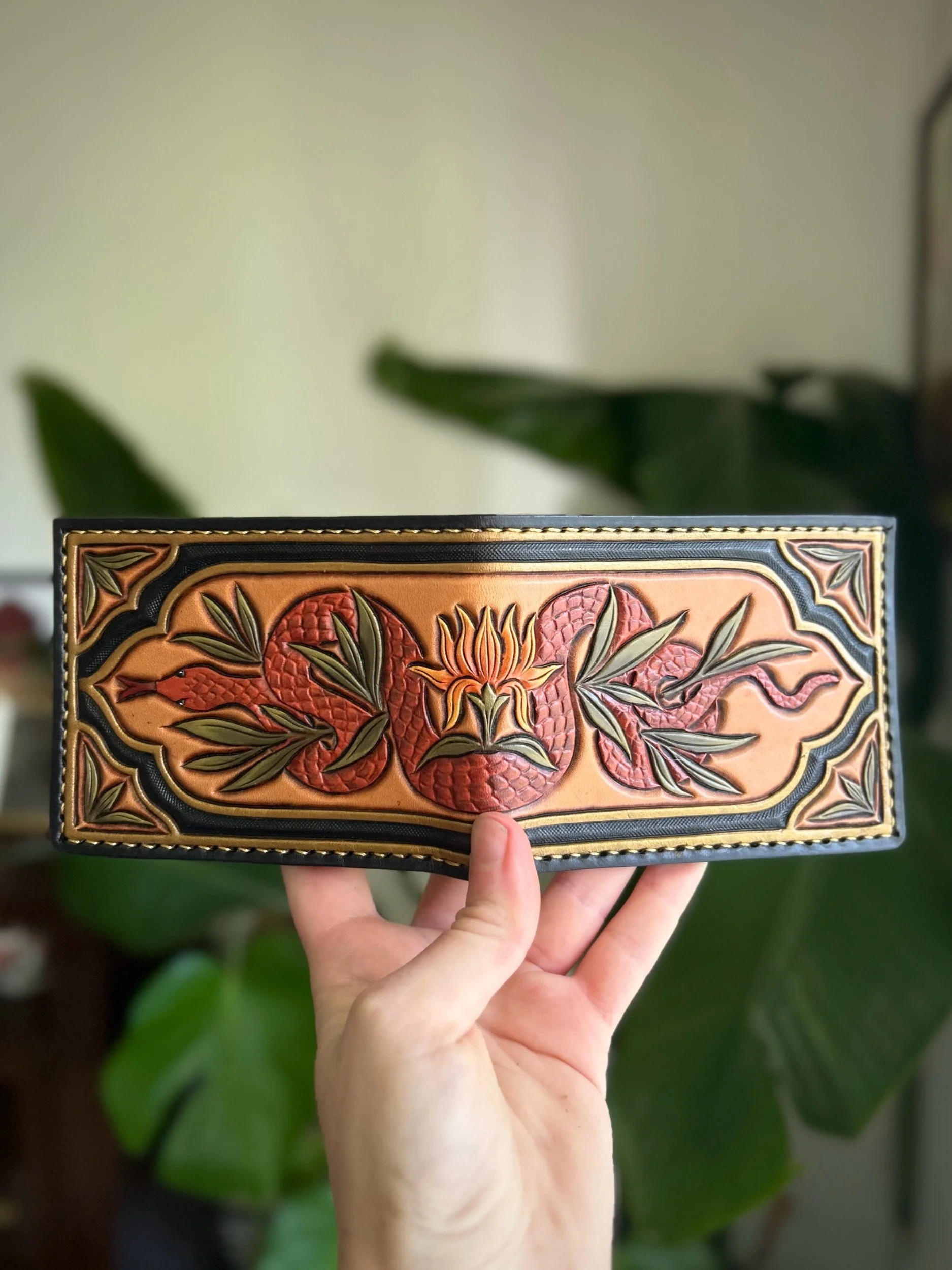 Hand tooled, dyed, and sewn